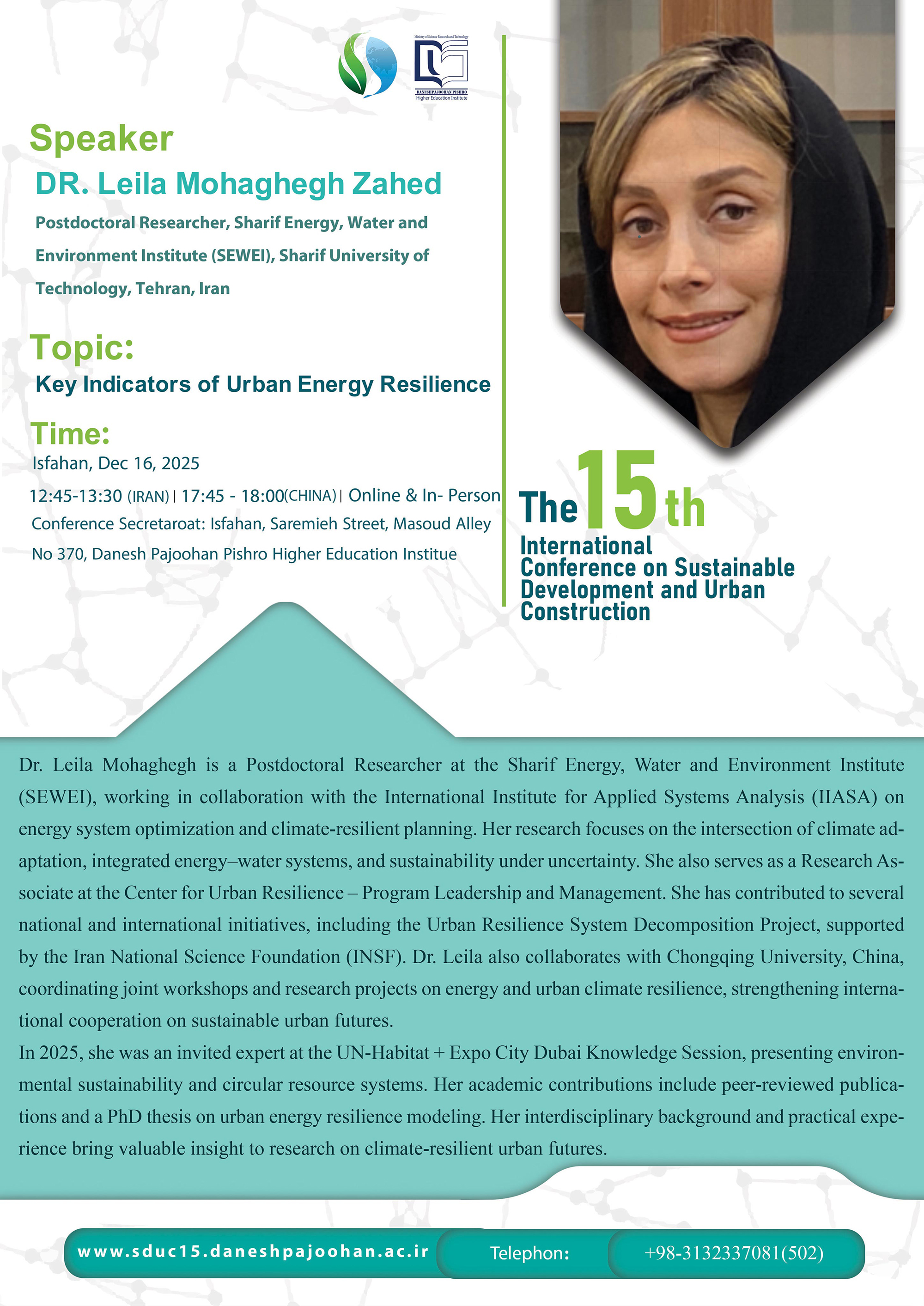 Amphitheater | 12:45- 13:30 | Dr. Leili Mohaghegh | Key Indicators of Urban Energy Resilience |