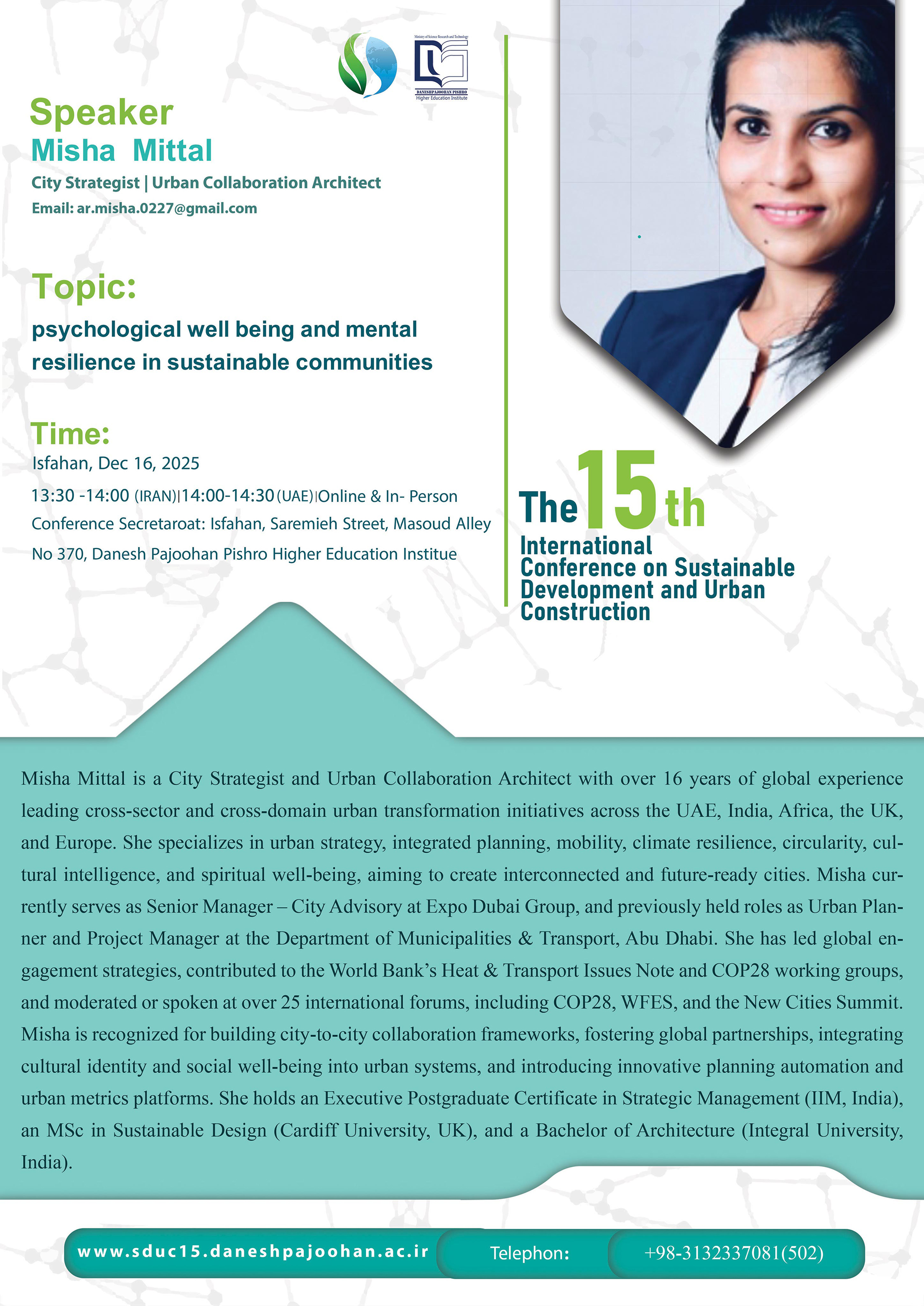 Amphitheater | 13:30- 14:00 | Misha Mittal | Psychological Well-being and Mental Resilience in Sustainable Communities |