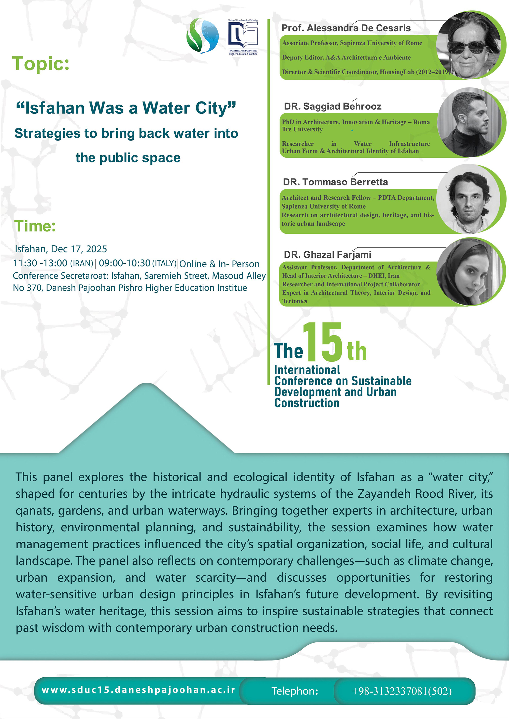 Amphitheater | 11:30- 13:00 | Dr. Ghazal Farjami | “Isfahan was a Water city”. Strategies to Bring Back Water into the Public Space |