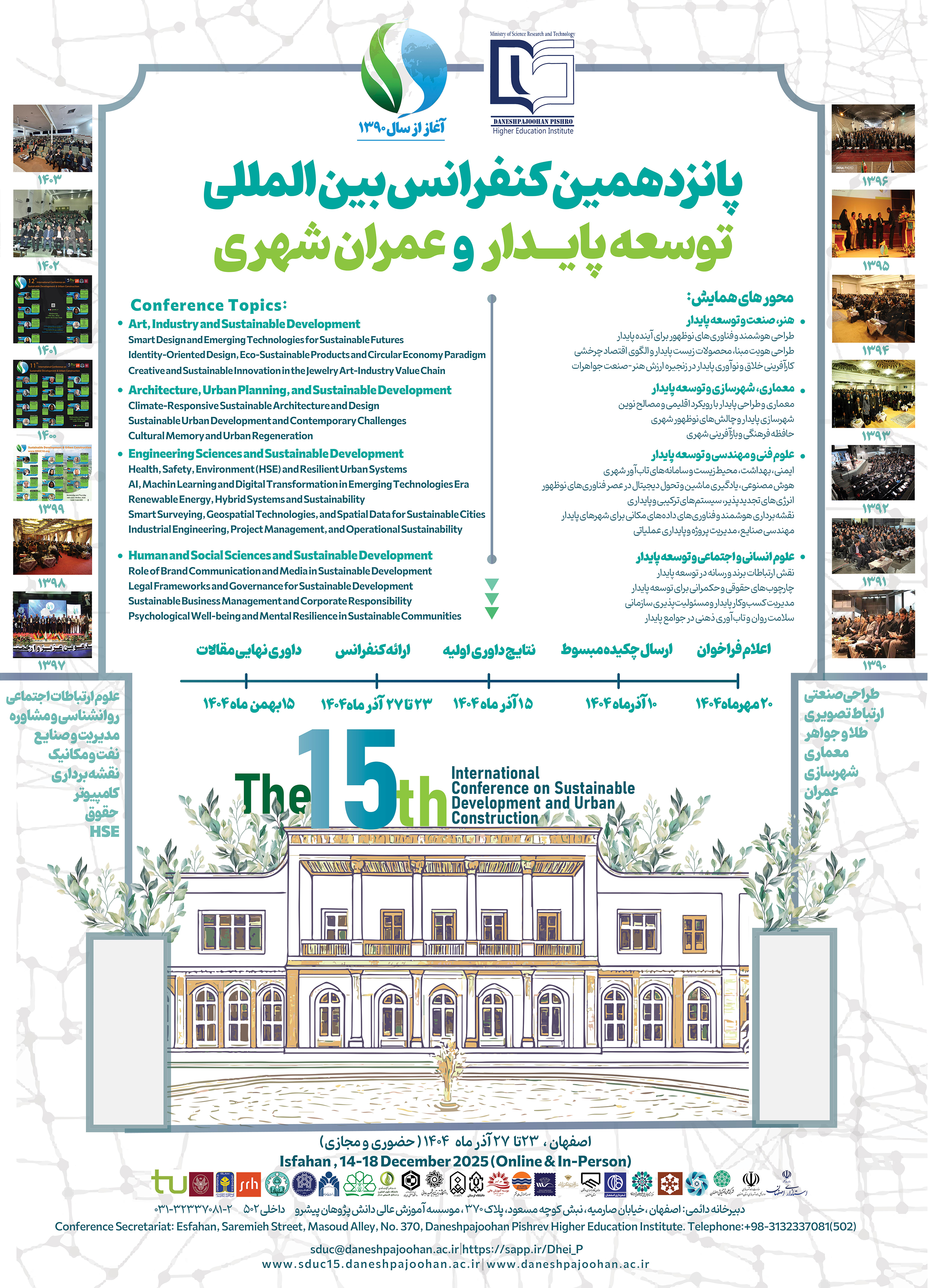 پانزدهمین دوره «کنفرانس بین‌المللی توسعه پایدار و عمران شهری» با هدف تبادل دستاوردهای علمی، فنی و تجربی در مسیر تحقق پایداری، به میزبانی مؤسسه آموزش عالي دانش‌پژوهان پيشرو و دانشگاه‌های داخلي و خارجي و با همکاری نهادهای علمی، پژوهشی و صنعتی کشور، در تاریخ 23 تا 27 آذرماه سال جاری برگزار خواهد شد. این رویداد علمی پژوهشی که اکنون به یکی از معتبرترین گردهمایی‌های میان‌رشته‌ای در حوزه توسعه پایدار شناخته شده است، فرصتی ارزشمند برای گفت‌وگو، یادگیری و ارائه نوآوری‌ها در عرصه‌های گوناگون شهری، زیست‌محیطی، اجتماعی، فناورانه و هنر فراهم می‌سازد.
