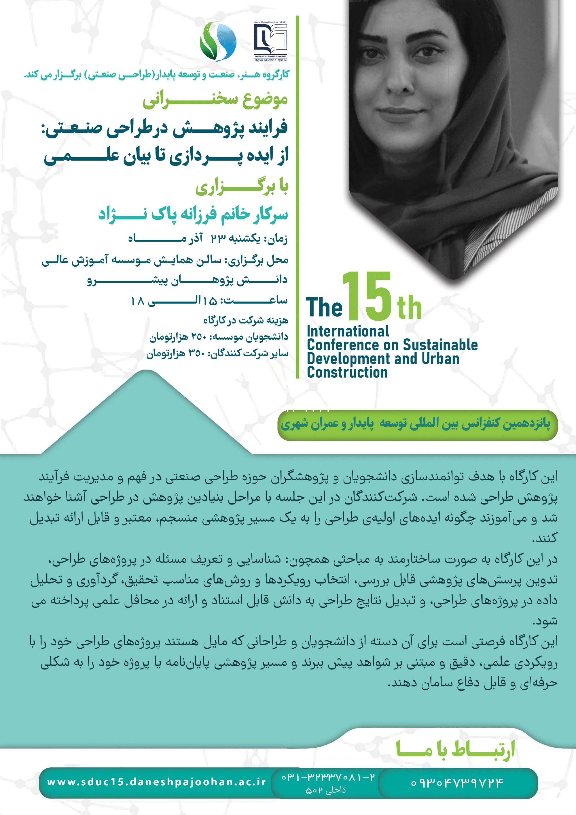 فرآیند پژوهش در طراحی صنعتی: از ایده پردازی تا بیان عملی | سرکار خانم فرزانه پاک نژاد | 15:00-18:00 | آمفی تئاتر |