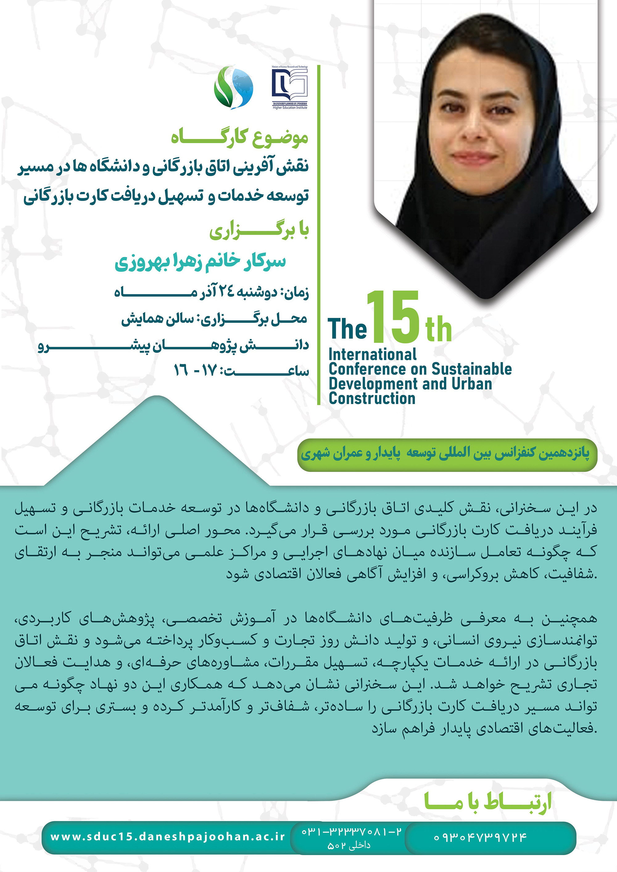 نقش آفرینی اتاق بازرگانی و دانشگاه ها در مسیر توسعه خدمات و تسهیل دریافت کارت بازرگانی | سرکار خانم زهرا بهروزی | 16:00-17:00 | آمفی تئاتر |