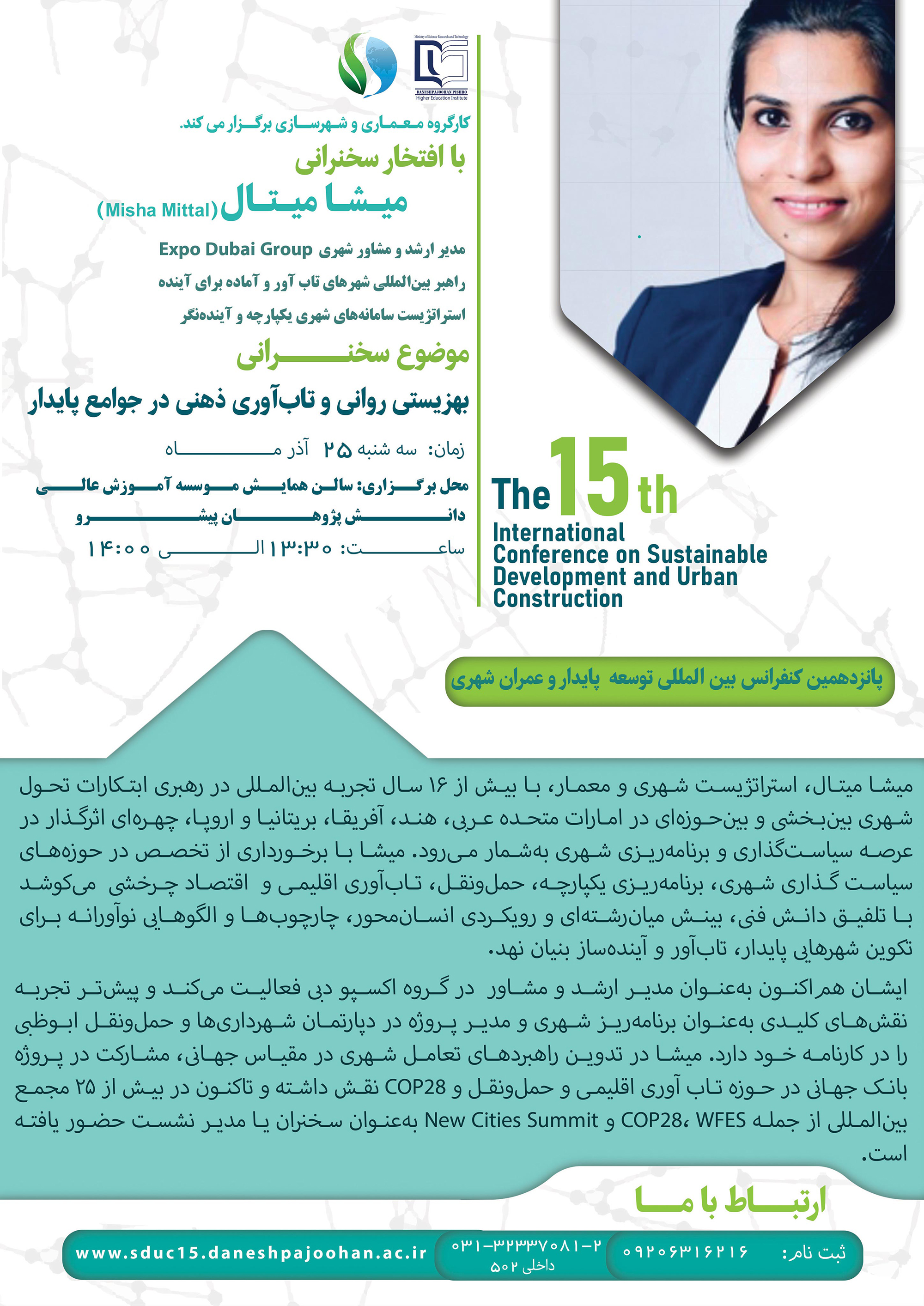 1404/09/25 | psychological well-being and mental resilience in sustainable communities | Misha Mittal UAE Country Chair Smart & Sustainable) Cities Wing ) | 13:30-14:00 | شهرسازی روانشناسی و مشاوره |