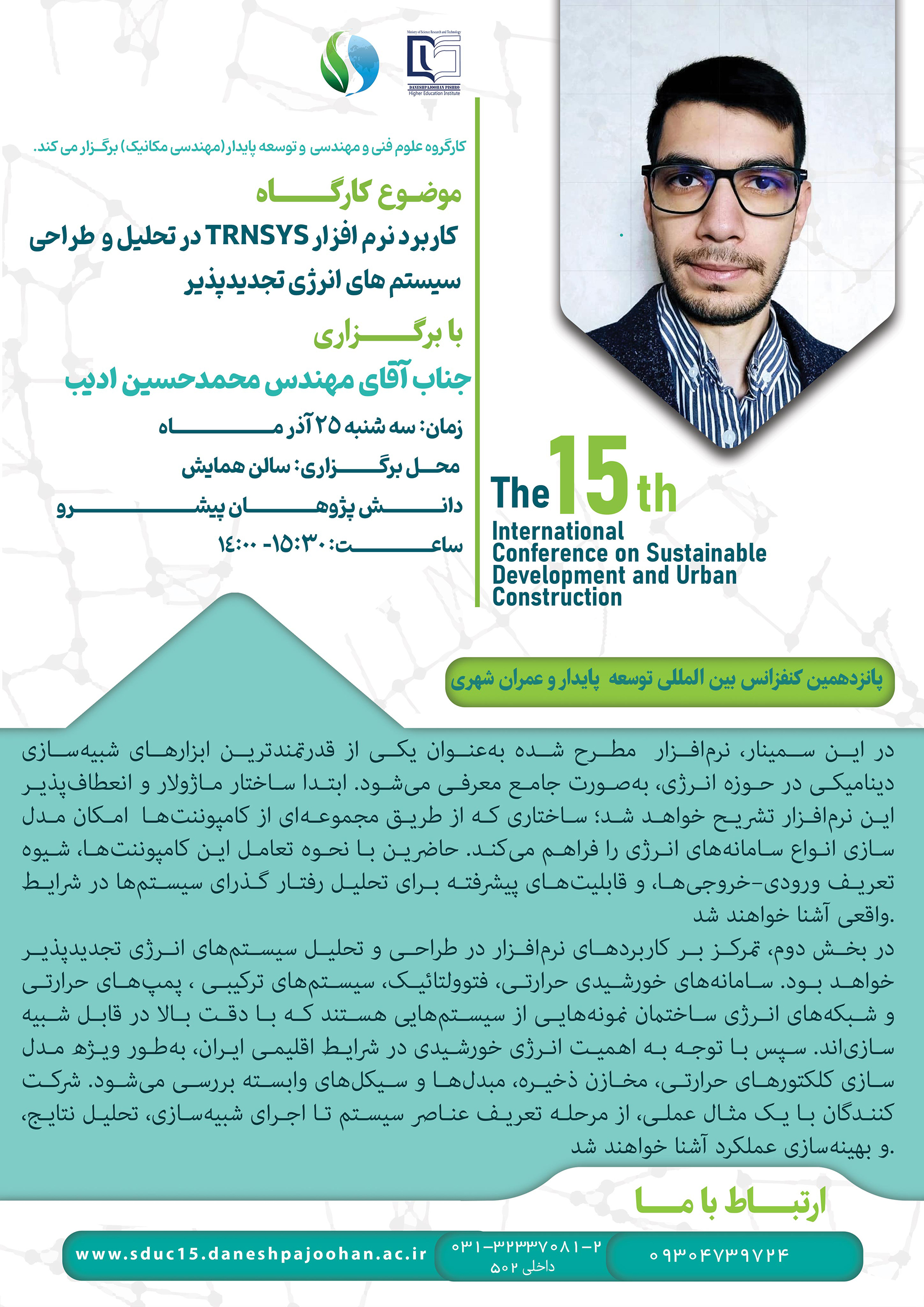 1404/09/25 | کاربردهای نرمافزار TRNSYS در تحلیل و طراحی سیستمهای انرژی تجدیدپذیر | مهندس محمدحسین ادیب | 14:00-15:30 | مکانیک عمران معماری محیط زیست شهرسازی HSE |